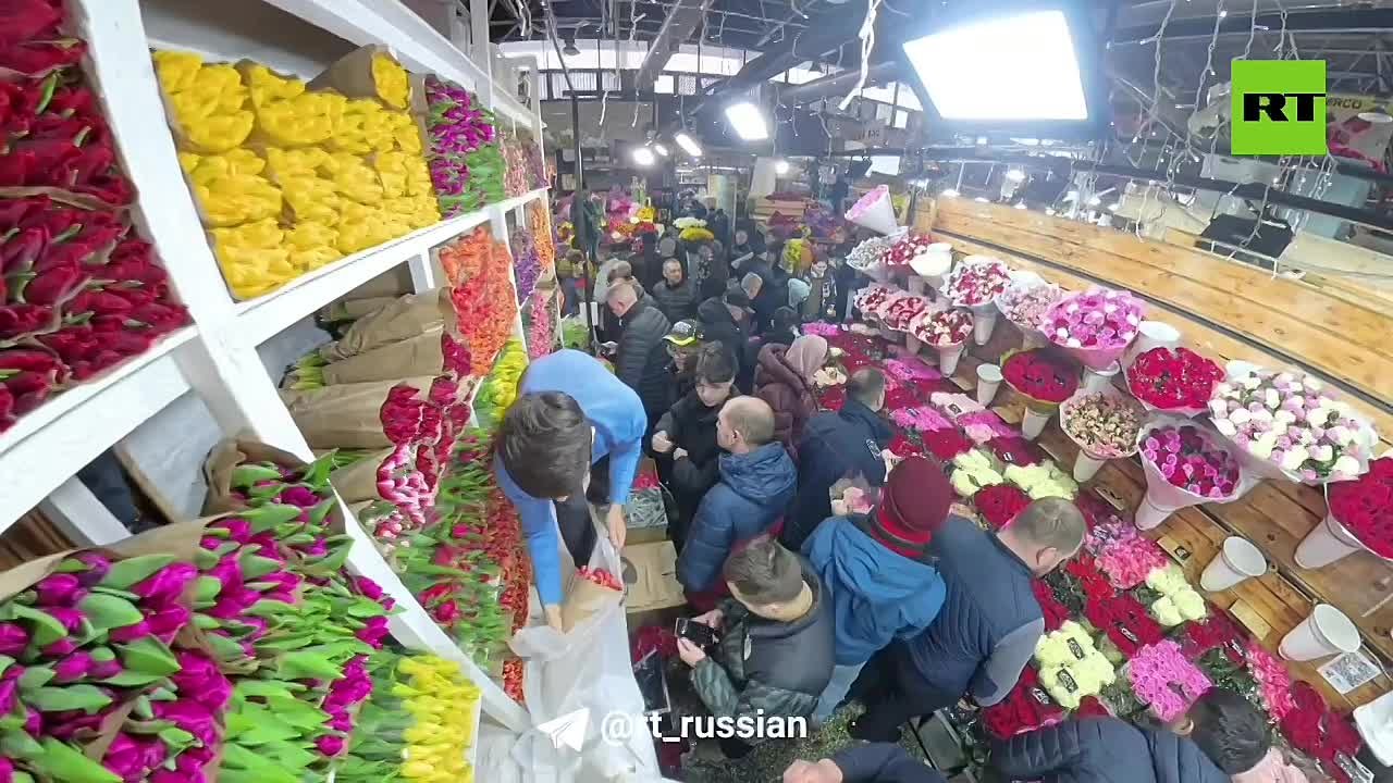 Обстановка на Рижском рынке в Москве — в объективе камеры 360°. Мужчины с самого утра штурмуют цветочные прилавки.