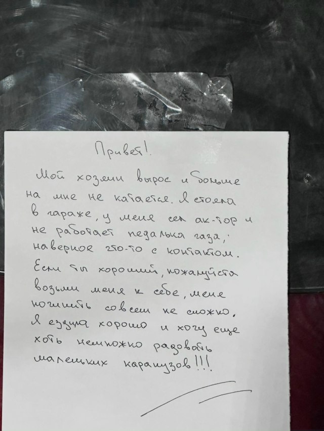 Кто-то выставил у мусорки детский электрокар, но не просто так, а с трогательной запиской от лица самой машинки.