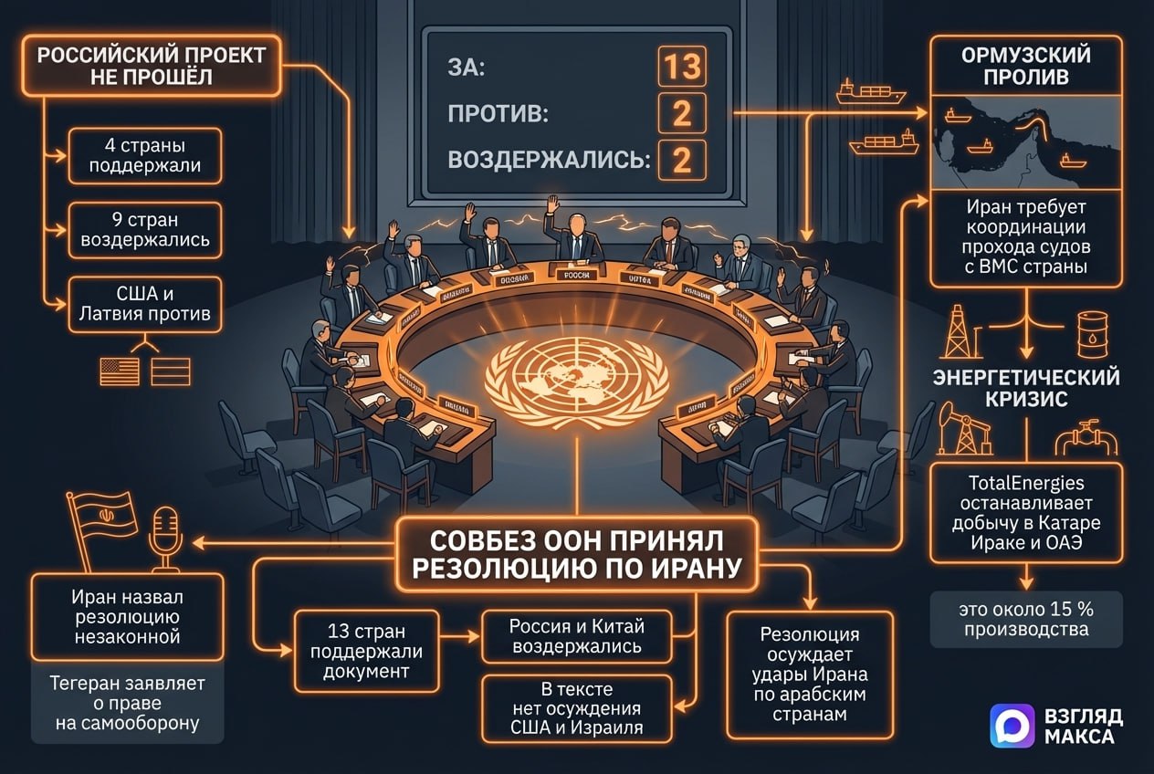Совет Безопасности ООН принял резолюцию с требованием к Ирану немедленно прекратить удары по арабским странам, но в документе не оказалось ни осуждения США и Израиля, ни призыва остановить их атаки против исламской республики. На этом фоне российский проект резолюции о прекращении огня поддержки не получил, Тегеран назвал принятое решение незаконным, а энергетический кризис в регионе продолжает усугубляться.