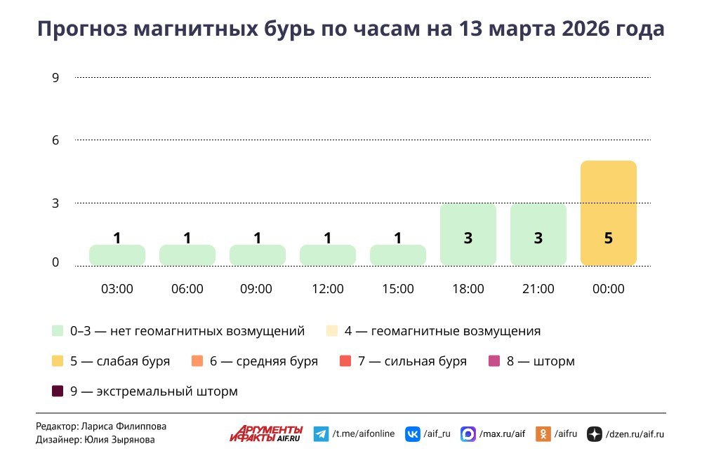 При этом 13 марта ожидается слабая магнитная буря. Ее вероятность составляет 56%.