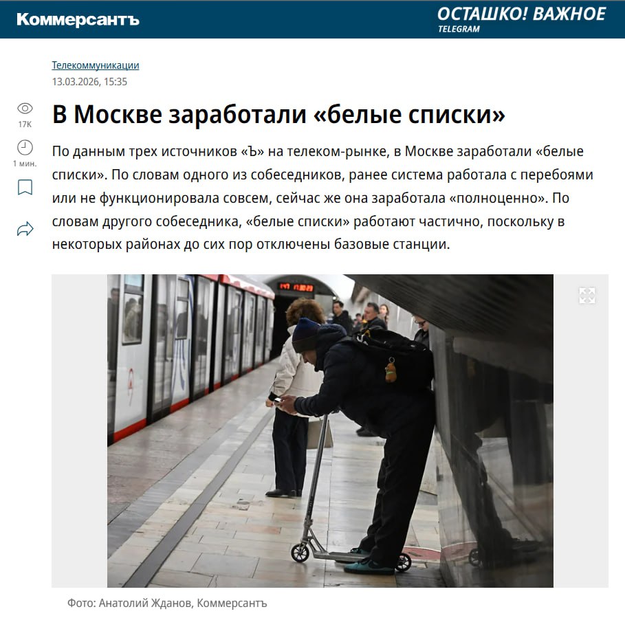Корреспондент издания проверил работу системы в московском метро. Мобильный интернет там работает только по «белому списку». Это означает, что доступ получают лишь те устройства и сервисы, которые внесены в специальный перечень, остальные соединения блокируются.