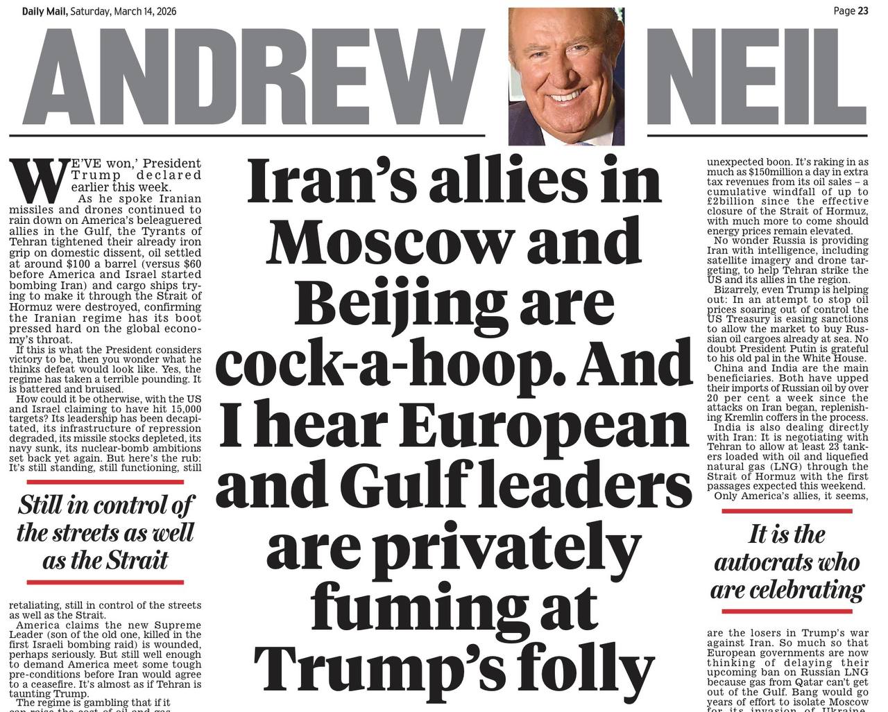 «Союзники Ирана в Москве и Пекине ликуют. И я слышу, что лидеры Европы и Персидского залива в частном порядке негодуют по поводу безрассудства Трампа». Под таким заголовком на страницах Daily Mail публикует сегодня статью известный британский журналист и телеведущий Эндрю Нил. Он пишет: