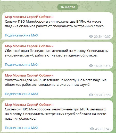 Мэр столицы Сергей Собянин сообщил, что с начала суток количество сбитых беспилотников на подлёте к Москве достигло 53. На местах падения обломков работают специалисты экстренных служб.