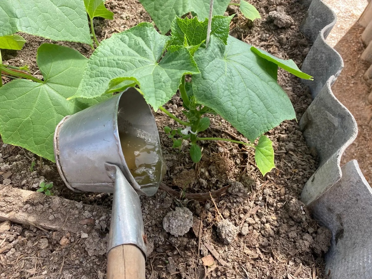 Растворить 10 г сухих или 100 г свежих дрожжей в 3 литрах тепловатой воды, добавить 2 столовые ложки сахара. Настоять 2-3 часа в тёплом месте и разбавить до 10 литров. Поливать огурцы по 0.5 литра на куст.