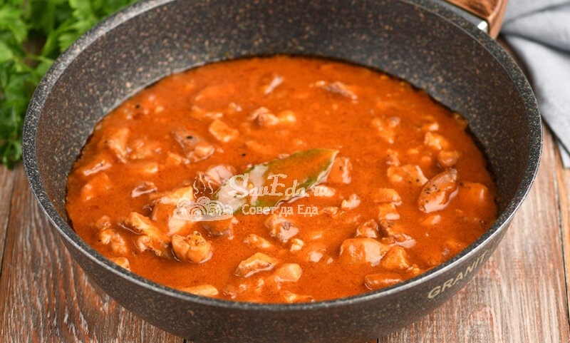 - Влить 800 мл воды, добавить щепотку сахара и лавровый лист. Накрыть крышкой и томить на медленном огне примерно 50 минут. Если подливка загустела, долить воду и продолжать готовить.