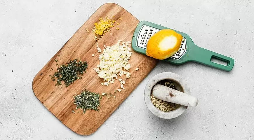 Для начала позаботьтесь о специях и травах. Свежее розмарин и тимьян мелко нарежьте, а семена фенхеля вместе с черным перцем разотрите в ступке. Чеснок очистите и нарежьте мелкими кусочками или пропустите через пресс. Как завершающий штрих, аккуратно снимите цедру с лимона с помощью терки.