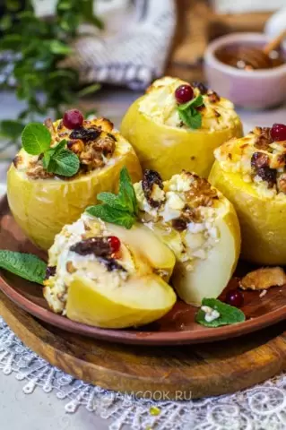 Начинку наполняют в подготовленные яблоки и помещают их в чашу аэрогриля. Запекаются яблоки около 30 минут при температуре 180°C. Если верхушки начнут слишком румяниться, стоит прикрыть их фольгой, чтобы избежать подгорания.