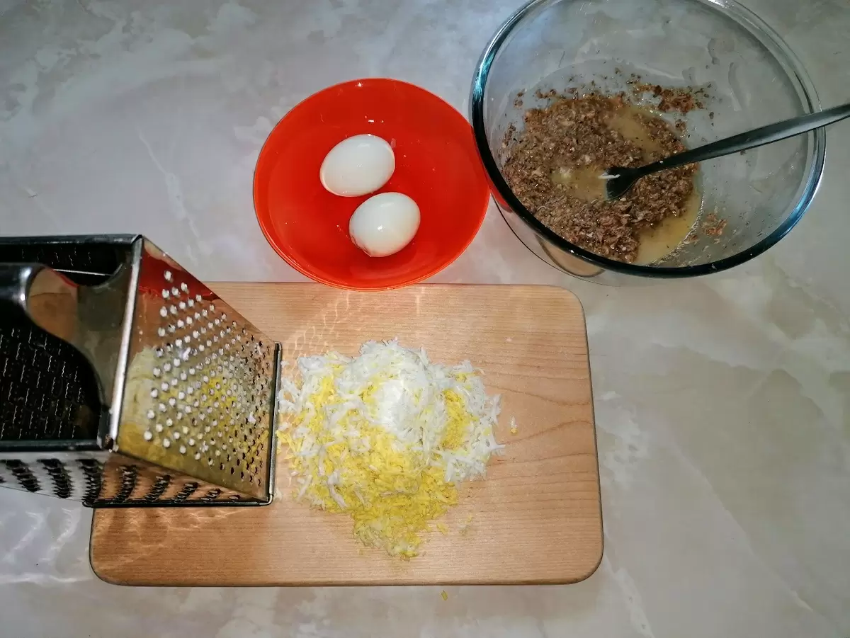 - Измельчите вареные яйца на мелкой терке и добавьте их к рыбе.