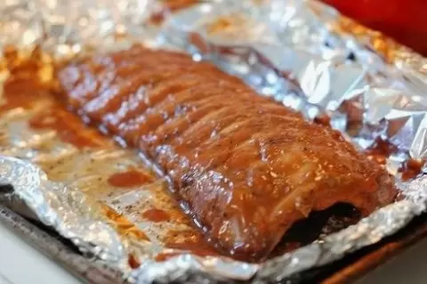 Включить духовку и подготовить фольгу, сложив её вдвое. Выложить на фольгу ломтики замаринованной свинины.