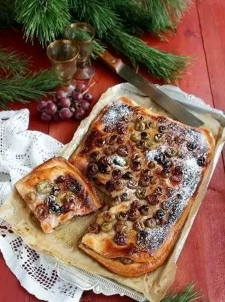 После этого тесто переносится в теплое место и оставляется на 1-1,5 часа до увеличения в объеме. Когда тесто подходит, его делят пополам и раскатывают в прямоугольники. Первый пласт покрывают виноградом, посыпают сахаром и пряностями, а затем накрывают вторым слоем теста, повторяя те же действия с начинкой.