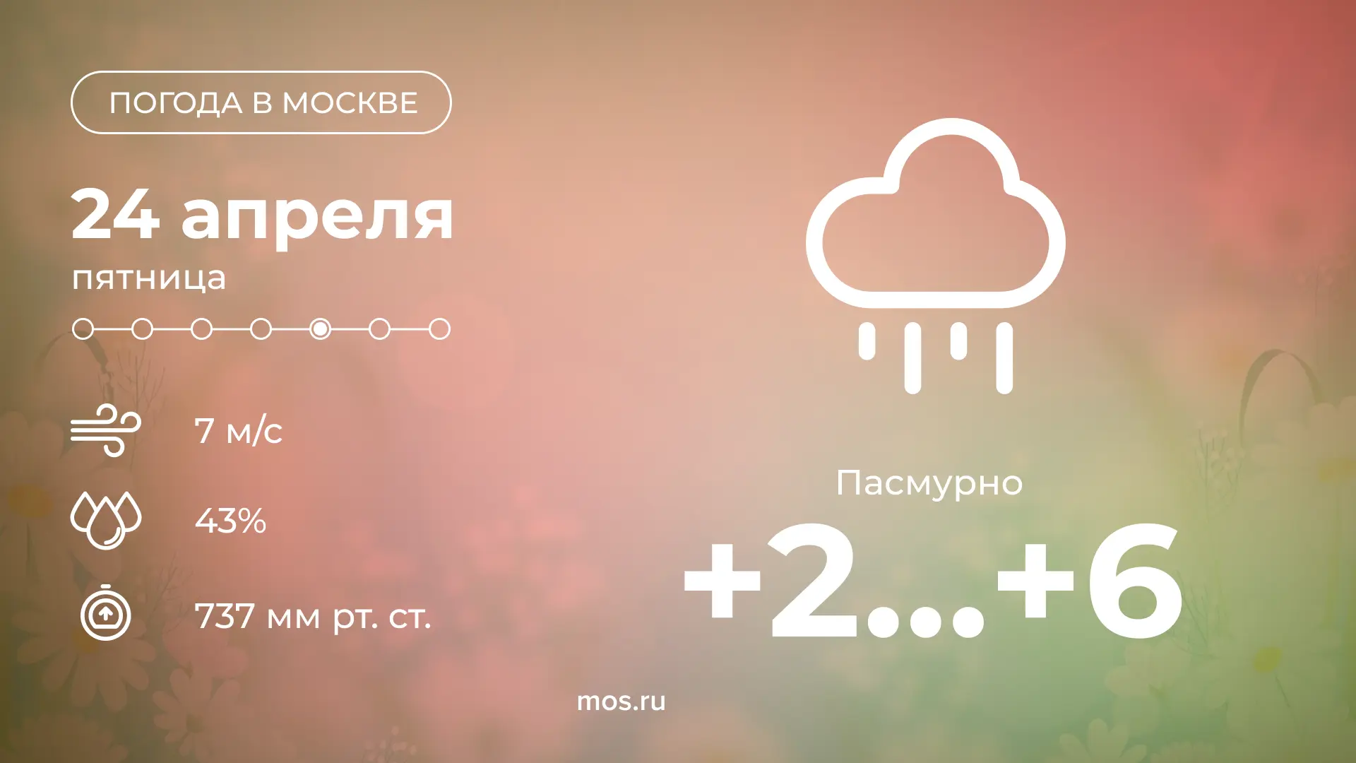 Доброе утро! Сегодня в Москве будет пасмурно. Столбики термометров покажут от +2 до +6 °С.