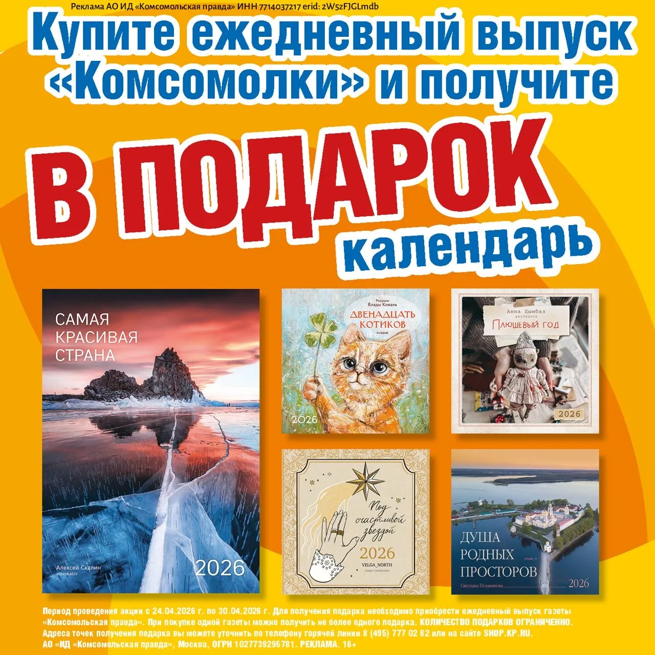 Для получения календаря в подарок вам достаточно приобрести ежедневный выпуск "Комсомолки" в одном из пунктов продаж Москвы и МО в период с 24 по 30 апреля 2026 года.
