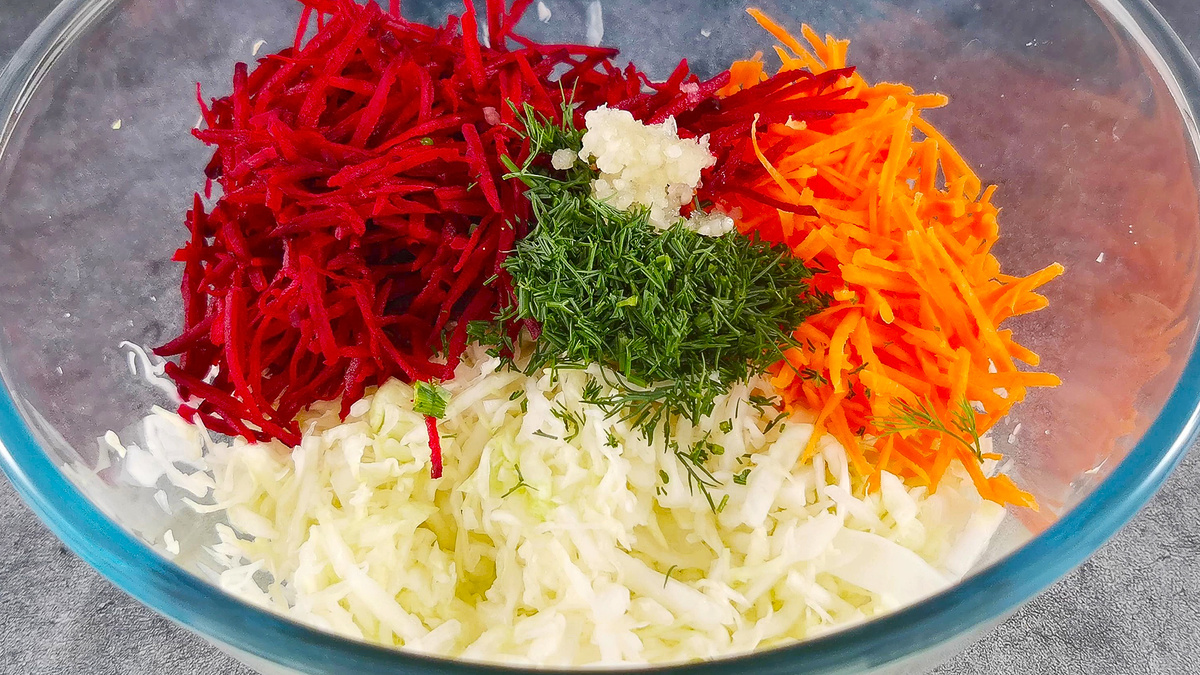 Следующим этапом будет добавление моркови и свеклы, которые следует натереть на терке для корейских овощей, что придаст салату особую текстуру. Затем мелко нарезанный укроп и чеснок, пропущенный через пресс, завершат этот великолепный союз овощей.