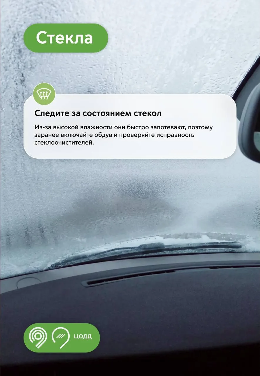 Следите за состоянием стекол. Из-за высокой влажности они быстро запотевают. Заранее включайте обдув и проверяйте исправность стеклоочистителей.