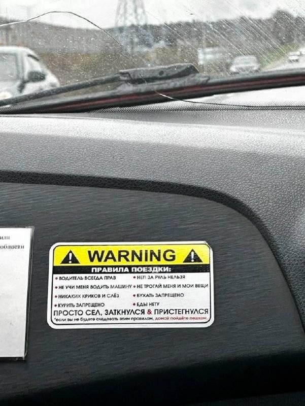 На стикере — целый свод правил: водитель всегда прав, не учить вождению, не трогать личные вещи, без криков и слёз. А внизу жирным: «Просто сел, заткнулся и пристегнулся».