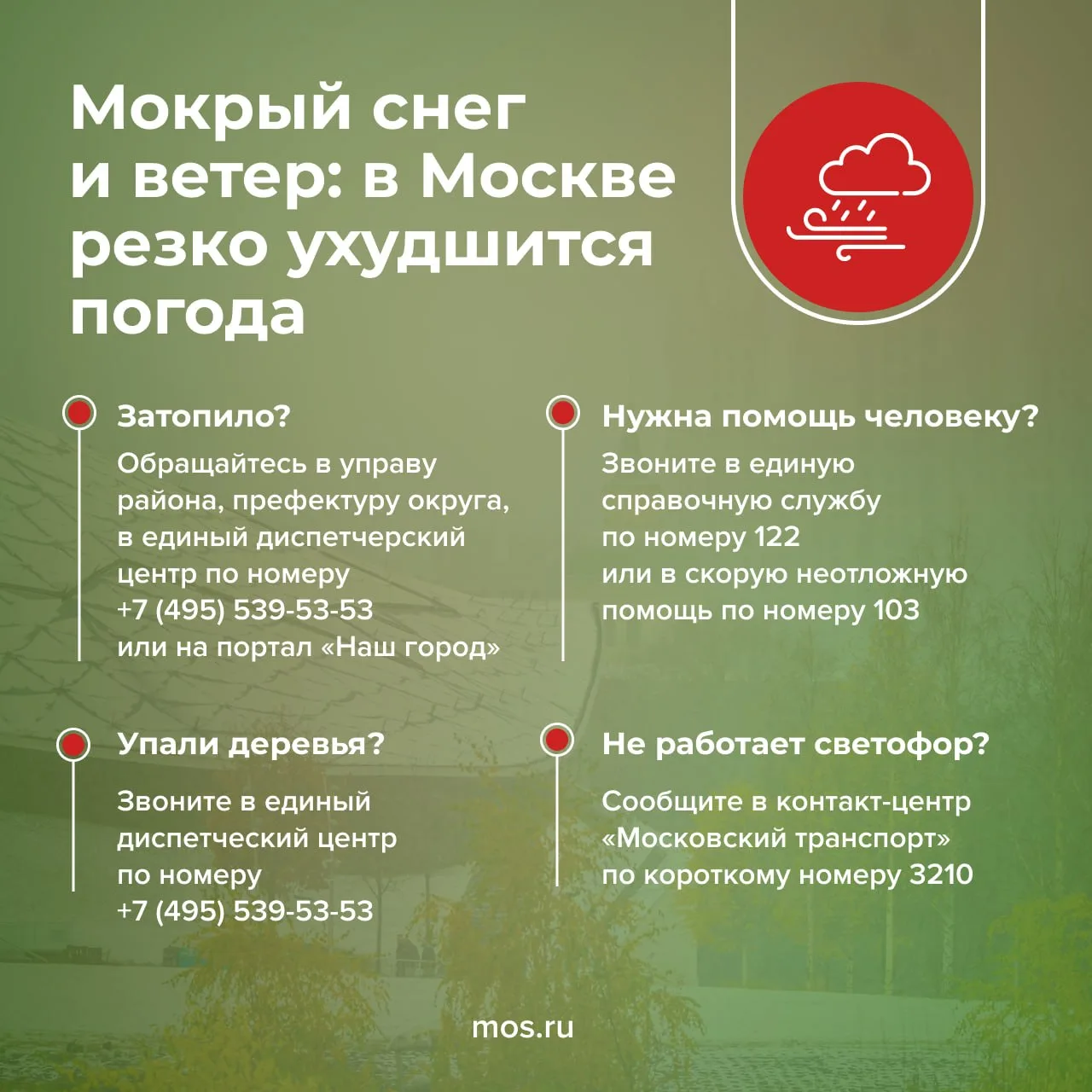 Метеоусловия в городе ухудшатся, непогода продлится до конца дня. Ожидается мокрый снег, местами гололедица, а также шквалистое усиление ветра с порывами до 23 м/с. Горожан просят по возможности не выходить на улицу.