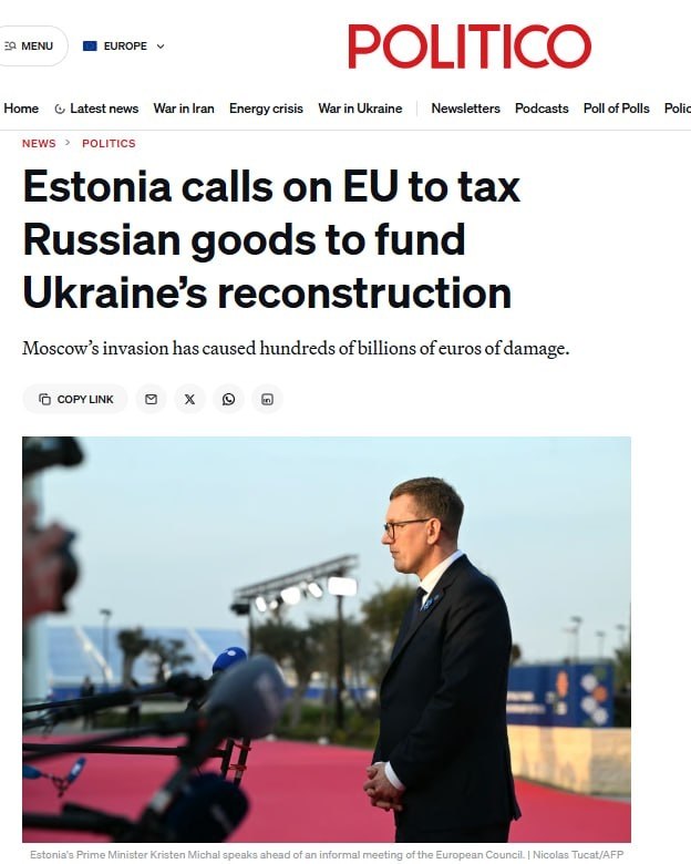 Европейские политики придумали новый способ нажиться на России. Премьер-министр Эстонии Кристен Михал во время саммита ЕС на Кипре предложил ввести специальные пошлины на российские товары, предназначенные для Европы. Поступления, по его плану, должны пойти на восстановление Украины. По сути, хотят заставить Москву платить за ущерб, который сами европейцы нанесли за годы.