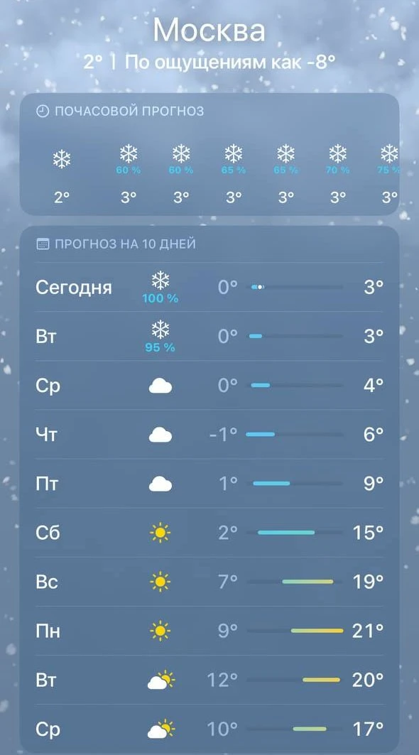 На метеостанции МГУ высота снега достигла 14 см, на ВДНХ — 12 см, а на Балчуге и в Тушино — 10 см. Ожидается, что в течение дня выпадет 19 мм осадков, сообщил ведущий специалист центра погоды «Фобос» Евгений Тишковец.Снег в апреле 2026...