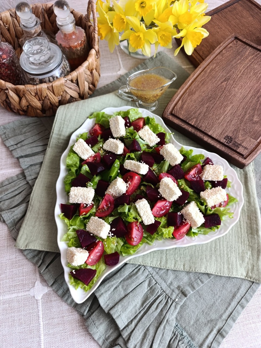 Листья салата разорвите руками и слегка полейте соусом. Затем выложите на них черри, свёклу и кубики феты в кунжутной оболочке. Полейте остатками соуса, чтобы блюдо получилось завершённым.