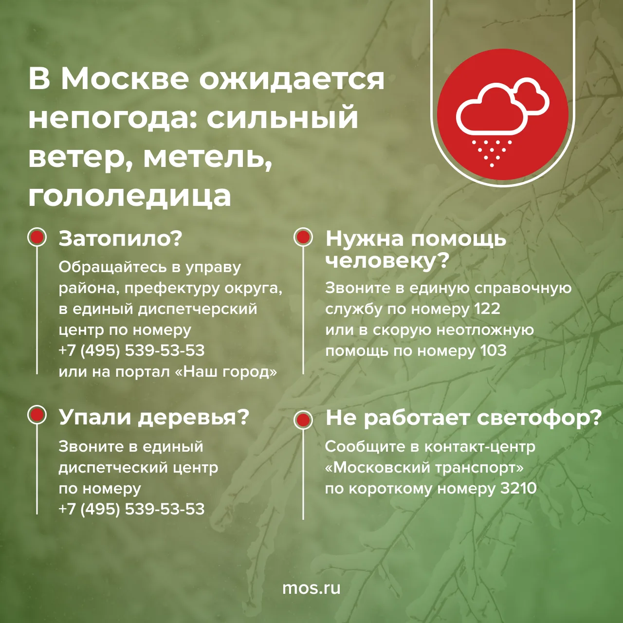 Сегодня в Москве ожидается сильный ветер, метель, налипание снега на проводах и деревьях и гололедица. Будьте осторожны!