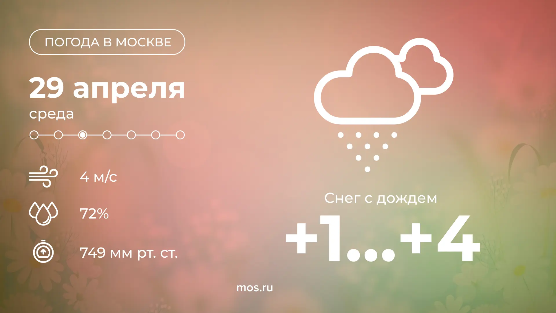 Доброе утро! Сегодня в Москве ожидается снег с дождем. Столбики термометров покажут от +1 до +4 °С. Одевайтесь теплее.