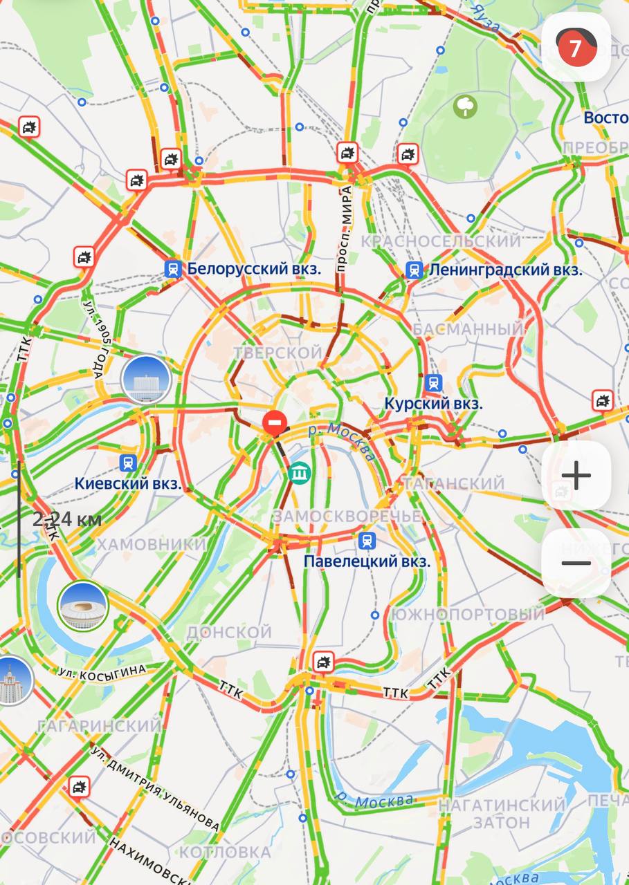 На дорогах Москвы уже 7 баллов и перекрытия.